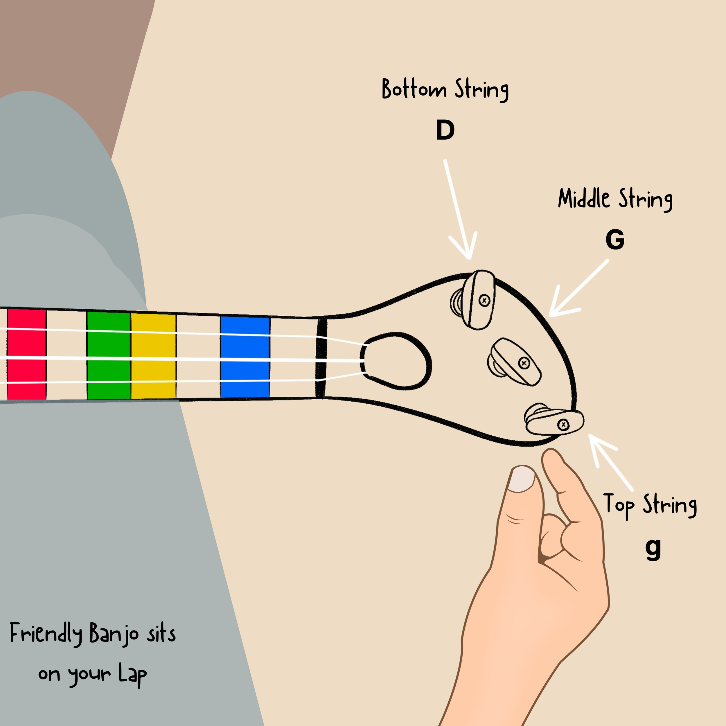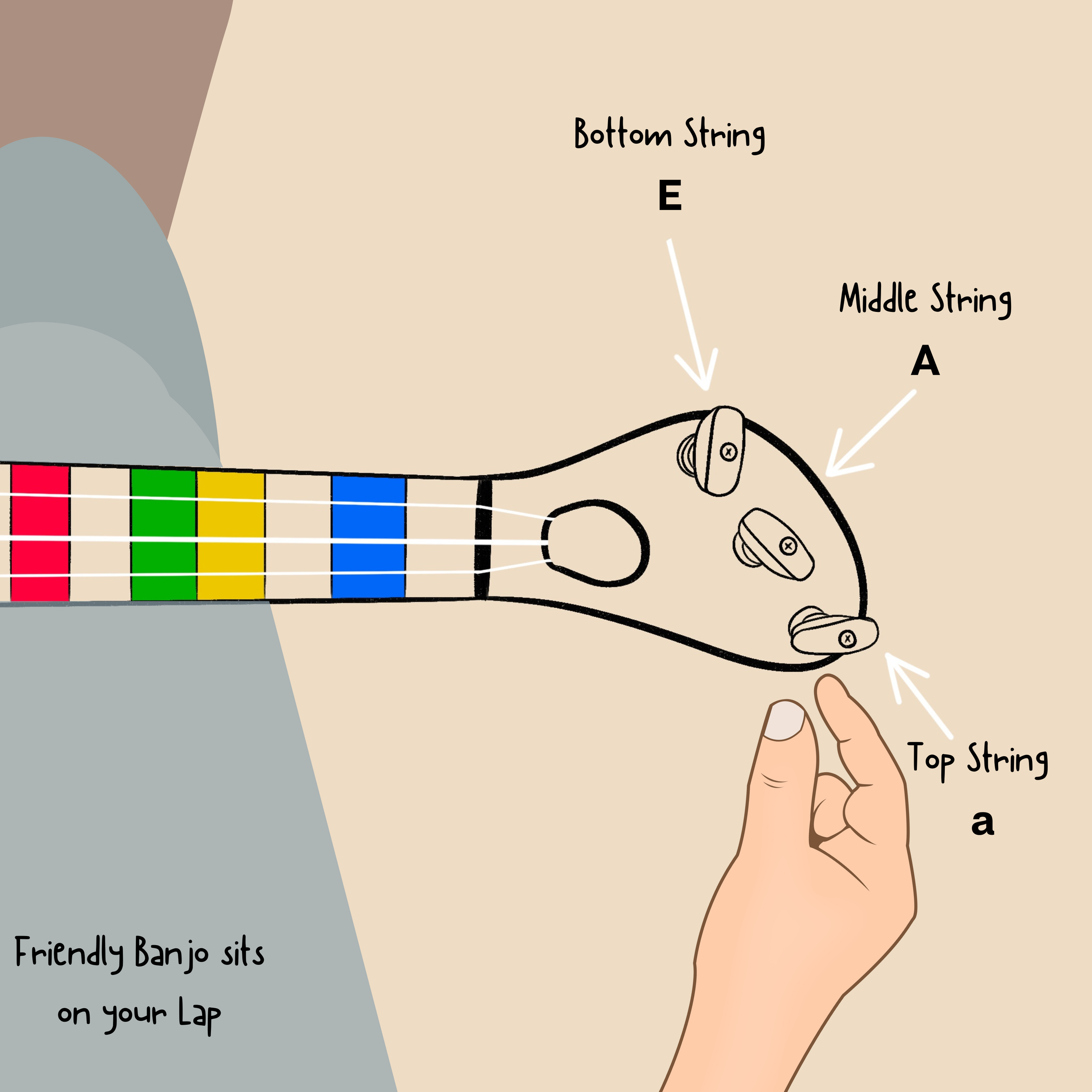 (Place the Friendly Banjo on your lap. Use your left hand to tune the strings and your right hand to pluck the strings.)
